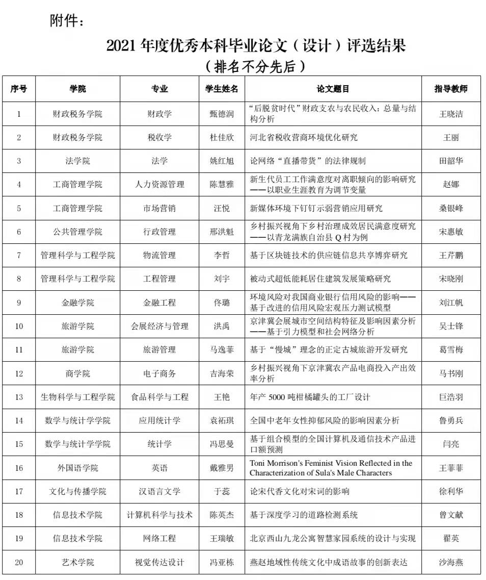 为进一步提升公司本科毕业论文(设计)质量,鼓励毕业论文(设计)指导教师勤勉治学,根据《太阳成集团tyc33455cc欢迎您普通本科毕业论文(设计)管理办法(2021 年修订)》(冀经贸教〔2021〕59 号),公司于本月组织开展了 2021 年度优秀本科毕业 论文(设计)评选工作,评选出 20 篇优秀毕业论文(设计) 。