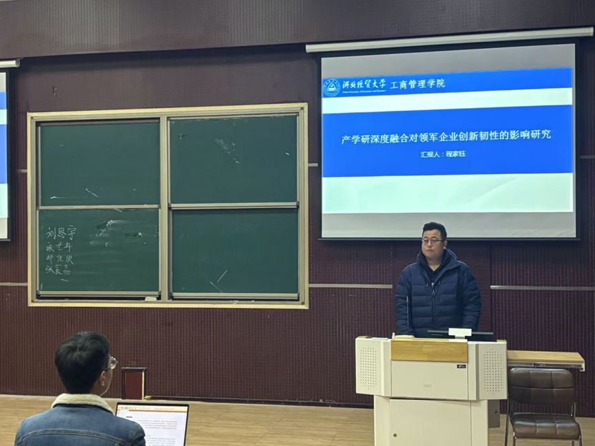 汇报人程家钰以“产学研深度融合对领军企业创新韧性的影响研究”为题,从理论背景、研究设计、实证结果、创新与不足四个部分展开汇报。以制造业领军企业为研究样本,从产学研创新主体融合、创新链路融通、创新要素耦合三个维度考察了产学研深度融合对领军企业创新韧性的影响,为理解产学研合作在提升企业创新能力中的作用提供了实证依据。