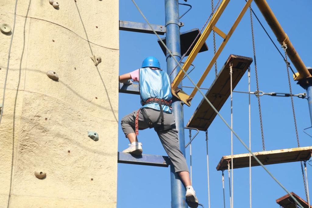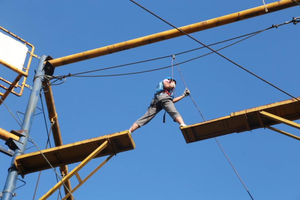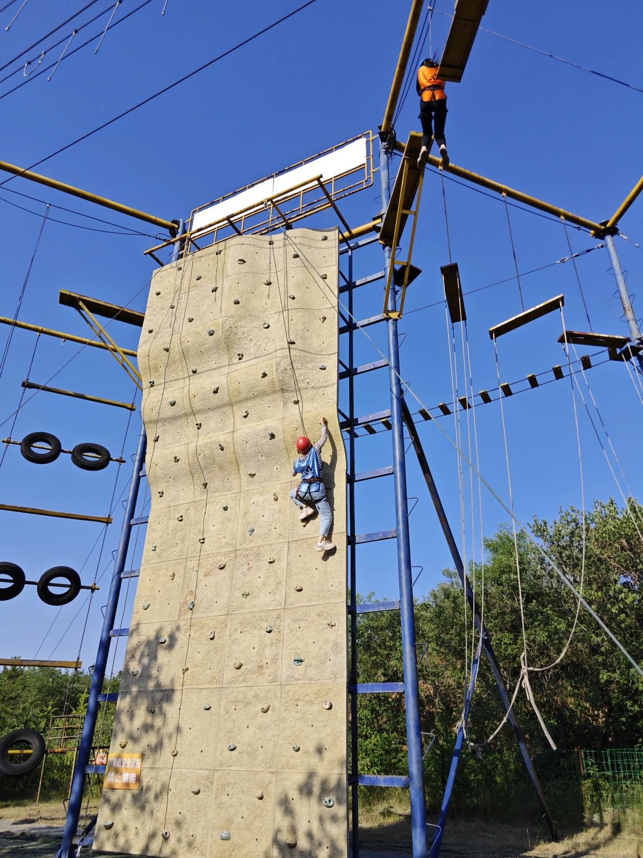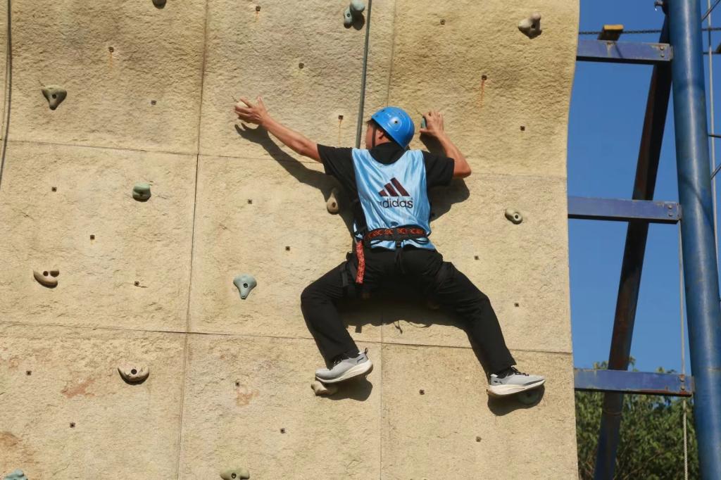 经过短暂的休整,来到了更具难度与高度的挑战项目。教师们身着专业装备,向着陡峭的岩壁发起挑战,每一次攀爬、每一次跨越,都是对自我的一次挑战。教师们勇敢尝试“高空断桥”和“极限攀岩”,在一次次攀登与跨越中挑战自我极限,锻炼胆识,展现了青年博士教师昂扬向上的精神风貌。
