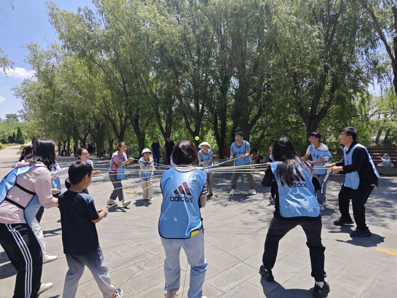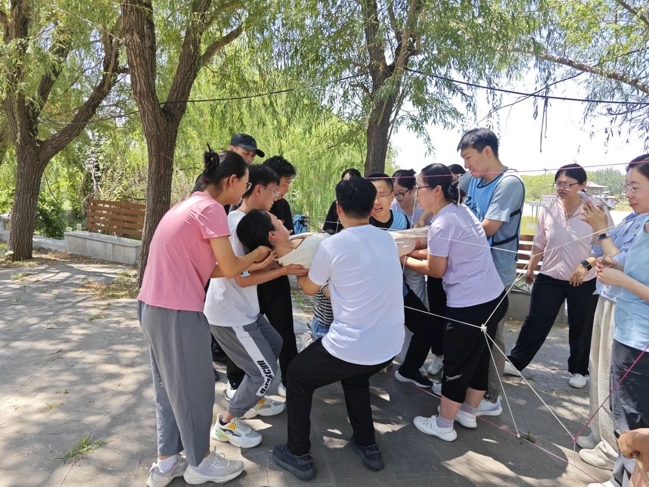 随后,在专业教练指导下,教师们投入到一系列精心设计的项目中。“过电网”考验了团队的计划性和执行力,面对模拟的“电网”障碍,大家绞尽脑汁,合理规划路线,小心翼翼地护送每一位队员通过,过程中充分展现出团队的智慧和默契。“团队同心鼓”项目更是需要成员们高度专注、密切配合,方能奏响和谐的乐章,队员们通过拉动绳索控制鼓面,使球在鼓面上连续跳动,这不仅考验着大家的协调能力,更让团队成员深刻体会到统一节奏、协同合作的重要性。在无声的配合中,队员们用心感受着彼此之间默契的不断提升,使“团结协作”的理念深入人心。