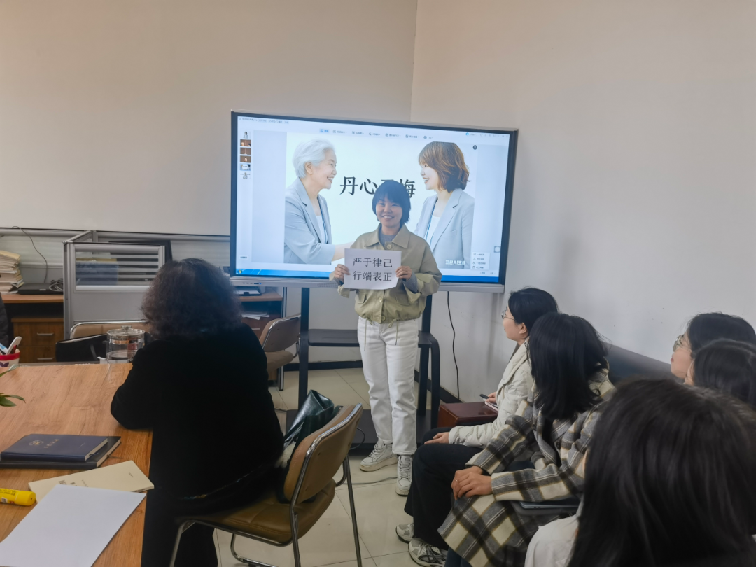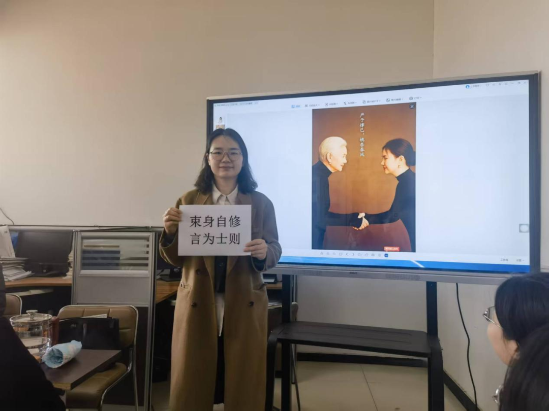 系主任耿立沙手持“束身自修,言为士则”手举牌,与未来的自己郑重握手。她表示:“这八个字是对自己的警醒,无论从教多少年,都要修身正己,言行皆可为员工榜样。”系教工党支部书记张彦青则选择了“严于律己,行端表正”,她分享道:“站在未来的自己面前,我想告诉她,现在的我没有懈怠,一直在努力做到言行端正、严于律己。”一张张合影定格美好瞬间,一句句格言铭刻师德承诺,让老师们在镜鉴中自省,在对话中坚定职业信念。
