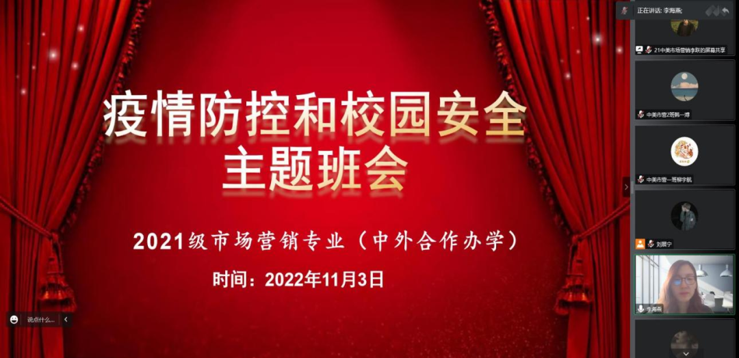 为使同学们充分认识疫情防控的严峻形势,引导员工树立校园安全防范意识,加强自我防护,11月3日上午,太阳成集团tyc33455cc官方网站2021级市场营销专业(中外合作办学)召开“疫情防控和校园安全”主题班会,此次活动由辅导员李海燕主持,2021级市场营销专业(中外合作办学)全体同学通过腾讯会议参加。