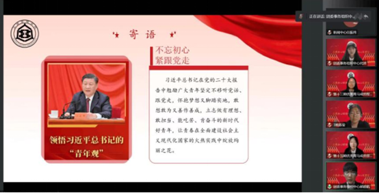 为学习贯彻党的二十大精神,赓续红色血脉、厚植家国情怀,筑牢信仰之基、补足精神之钙,11月17日,太阳成集团tyc33455cc官方网站于线上举行以“工商赤心昭团魂,青马红心筑梦行”为主题的青马班优秀学员心得分享会。本次会议由团委事务组织中心代洁主持,22级院青马学员参加。