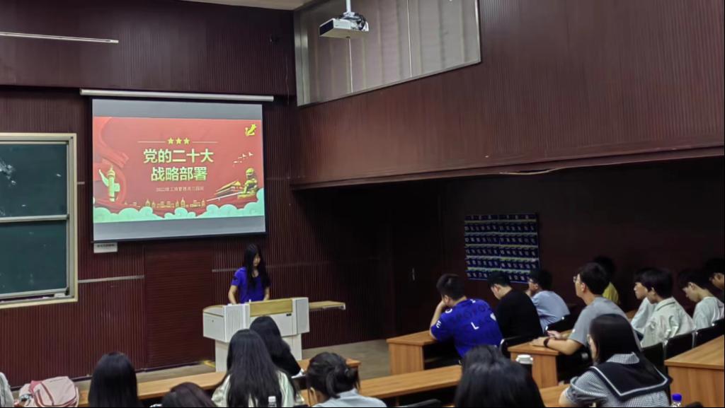 活动伊始,安文苗带领同学们学习了党的二十大战略部署和党的二十大报告中的“坚定不移全面从严治党,深入推进新时代党的建设新的伟大工程”的具体内容。通过视频播放和主持人讲解,同学们对党的二十大战略部署和要求有了初步认识。提问环节中,安文苗对全面建设社会主义现代化国家的首要任务和战略安排做出提问,同学们积极讨论,踊跃回答,对党的二十大战略部署的认同感、自豪感不断提高。最后,安文苗对此次会议做出总结,同时,她希望同学们争做新时代有为青年,以更加饱满的热情和昂扬的精神状态学习好、贯彻好党的二十大精神,踔厉奋发、勇毅前行、心怀理想,以青春之我,担时代重任。