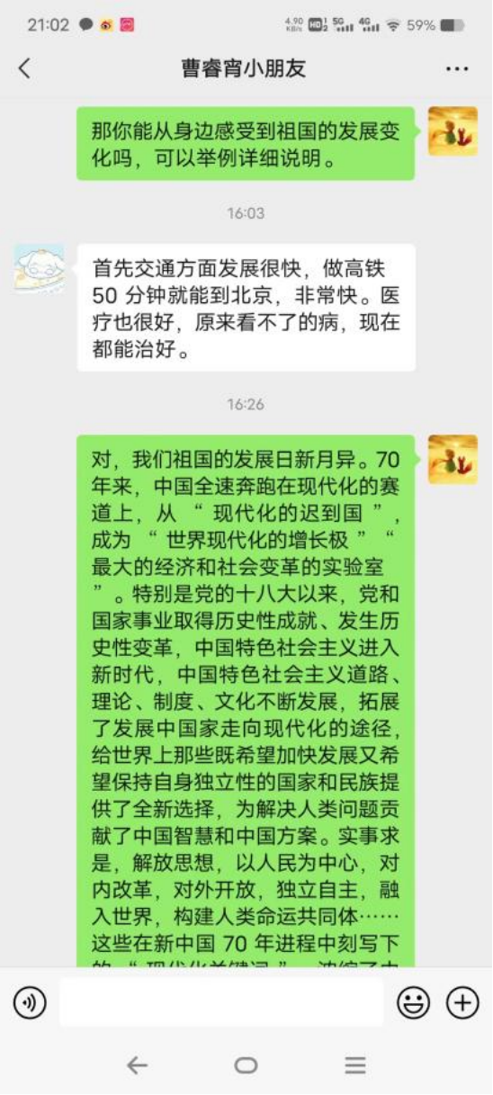 在“云研学,向未来”中,我们通过微信聊天的方式互相介绍了自己家乡的发展变化,了解了家乡的历史典故,并从身边举例详细说明了祖国的发展变化。小朋友介绍了她的家乡的历史典故有三国时期的桃园三结义,狼牙山五壮士,冉庄地道战等。我向她介绍了我们祖国日新月异的发展,祖国的强盛给她了莫大的鼓励,她希望在未来的一天也可以为祖国发展做贡献。了解完我们的祖国和家乡后,我们都为自己的祖国感到骄傲和自豪。线上课堂虽然时间较短,但十分有趣。小朋友在课堂问答中学习,思考,成长。我和小朋友也明白了身为当代中国青年,生逢盛世当不负盛世,要以青春之名,书写清澈挚爱,以心中红星,献礼华夏。