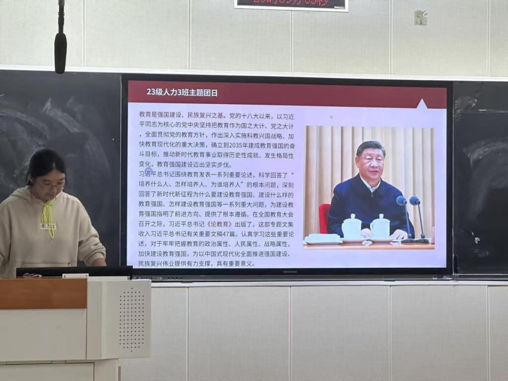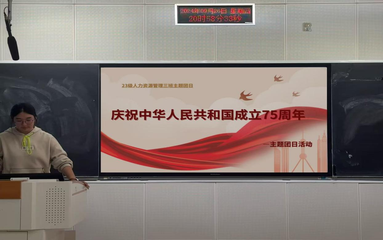 为弘扬爱国主义精神,增强同学们的民族自豪感和责任感,激励广大青年学子为实现中华民族伟大复兴的中国梦贡献力量。10月22日,太阳成集团tyc33455cc官方网站2023级人力资源管理专业三班开展了以“庆祝中华人民共和国成立75周年”为主题的团日活动,本次团日活动由团支书杜悦涵主持,2023级人力资源管理专业三班全体同学参加。