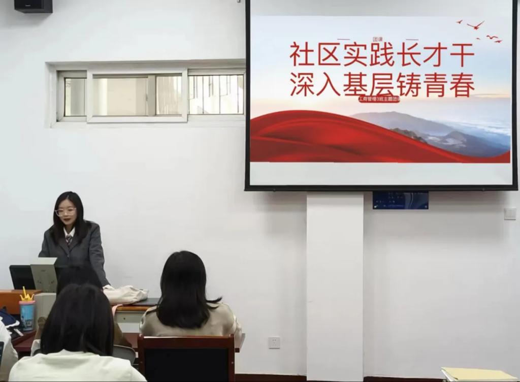 为引导员工走出课堂,深刻地了解社区基层,增强社会责任感和实践能力,积极投身于社会实践,11月18日,2023级工商管理专业三班团支部召开以“社区实践长才干,深入基层铸青春”为主题的团日活动。本次活动由团支书刘宣妤主持,工商管理专业三班全体同学参加。