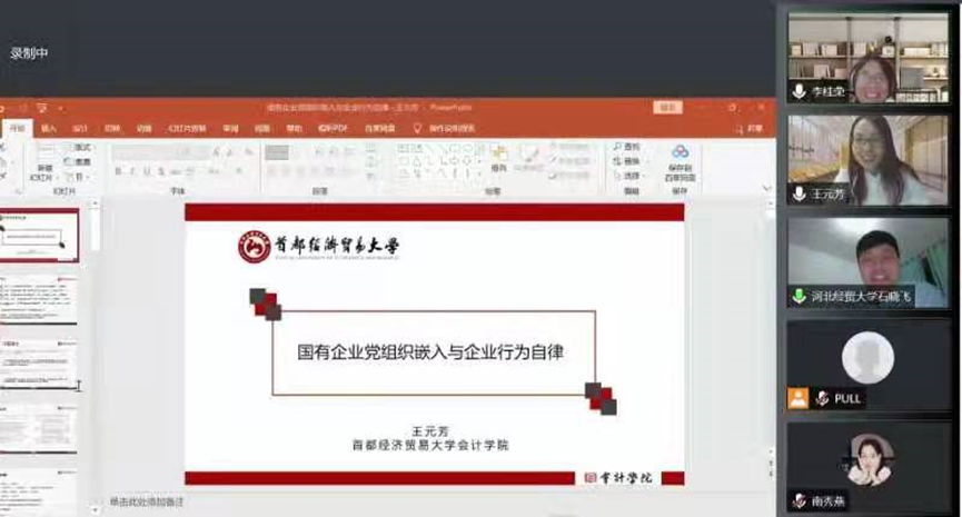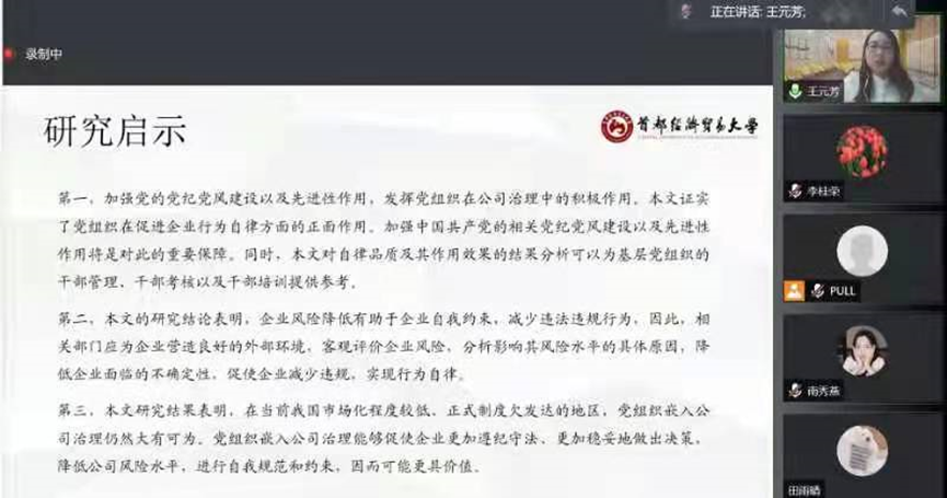 11月26日晚,太阳成集团tyc33455cc欢迎您第四届公司治理与企业成长高端论坛在线上举行。首都经贸大学会计公司王元芳博士应太阳成集团tyc33455cc官方网站邀请,通过腾讯会议平台作题为“国有企业党组织嵌入公司治理与企业行为自律”的学术报告。本次会议由太阳成集团tyc33455cc官方网站经理李桂荣主持,公司教师及研究生共100余人参加。