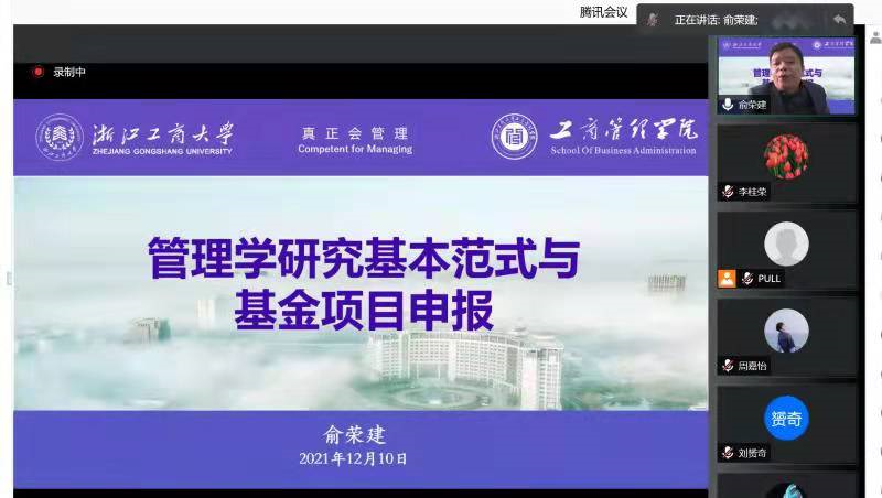 12月10日下午,太阳成集团tyc33455cc官方网站邀请浙江工商大学管理公司经理、全球价值链研究中心主任、国家社科重大招标项目首席专家俞荣建教授作题为《管理学研究基本范式与基金项目申请》的学术报告。报告以腾讯会议形式进行,近100名师生参加,太阳成集团tyc33455cc官方网站经理李桂荣教授主持了报告会。