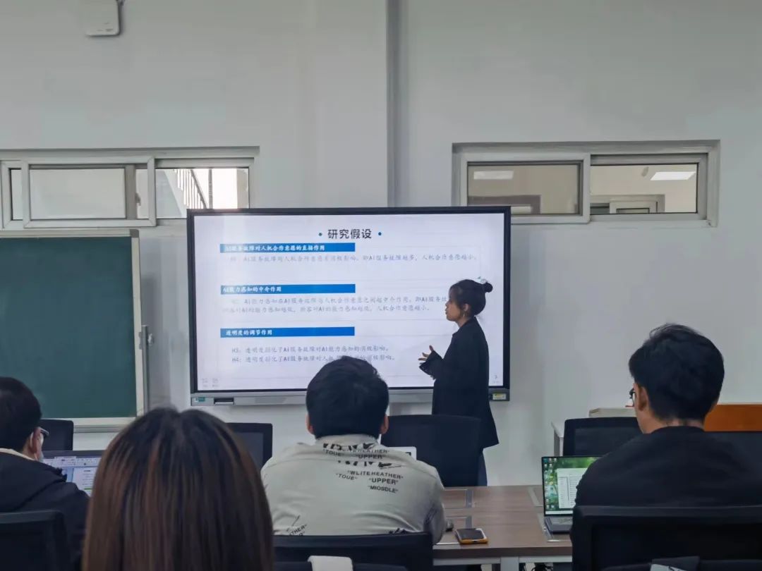 汇报人王雅婷以“AI服务故障对人机合作意愿的影响研究——透明度的调节作用”为题,从文献综述、论文的实践价值、理论价值、研究假设及主要创新点进行了讲解。并对AI故障、AI能力,人机合作意愿,透明度等名词进行了解释,并指出透明度的调节作用。