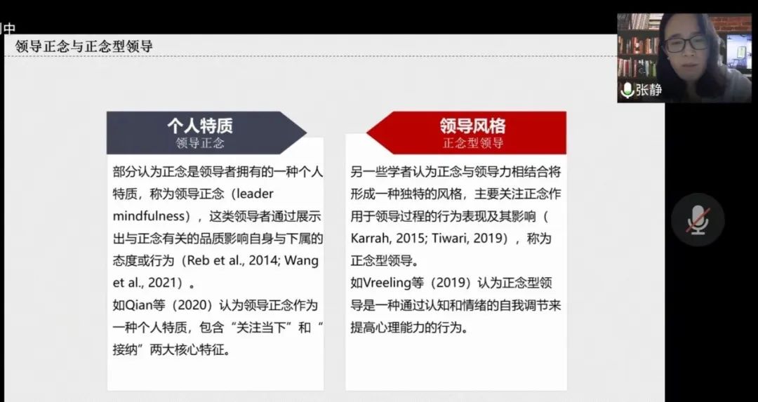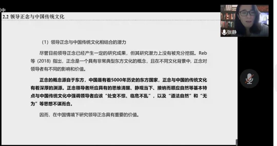 张静博士首先从正念的起源与定义、领导正念与正念型领导、领导正念测量与领导正念既有研究成果等四个方面详细讲解了组织中领导正念现状,指出正念对领导者具有重要价值,领导正念与正念型领导是两个不同的概念,领导正念属于个人特质,而正念型领导属于一种领导风格;正念的特征包括对当下的注意、对内外环境清晰的觉察以及接纳当下的体验。在此基础上,提出了领导正念行为的定义:领导者在工作中对人和对事所表现出来的具有正念特征的一系列行为(专注当下、保持觉察、接纳等),这些行为进而影响其自身与下属的工作态度与工作成果。接下来,张静博士从前因研究、正念干预训练研究的常用方法、影响效应(态度类变量、行为类变量)、中介效应及理论视角五个方面着重讲解了领导正念的既有研究成果。
