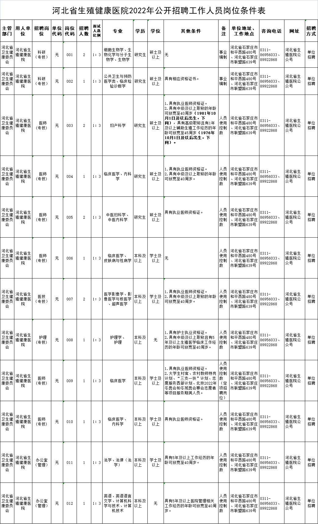 河北省生殖健康医院2022年面向社会公开招聘工作人员16名。具体招聘人数和岗位条件详见↓↓↓