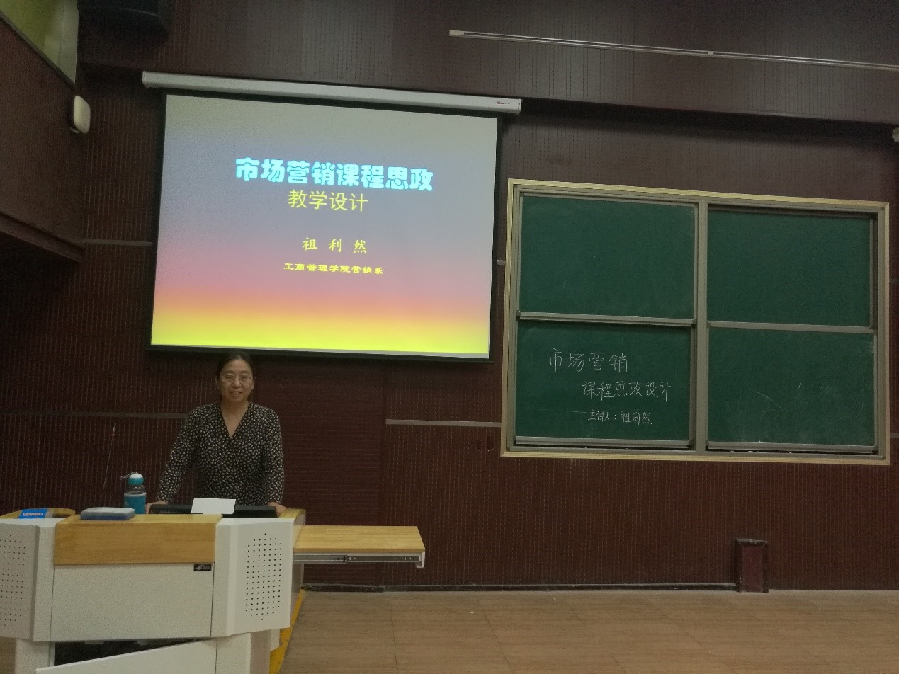 祖利然结合《市场营销学》课程,介绍了市场营销专业课程思政的目标、内容、原则和方法。首先,在思想观念上要确立 “育人”目的,深入学习习近平新时代中国特色社会主义思想,党和国家在政治、文化、社会、生态及党建方面的相关政策,从中挖掘思政元素,进而结合专业课程谈思想、说素养、讲故事,把思政教育渗透进学习过程的每一环节,包括培养方案、教材选用、课前预习、课堂教学、课后作业、案例讨论、社会实践等方面。其次,在将思政元素融入专业教学,运用马克思主义立场、观点和方法解释相关内容的同时,教师还要注重以德立身、以德立学、以德施教,为员工点亮理想的灯、照亮前行的路。最后,她以“宏观环境分析”一节为例,直观地展示了专业课程思政教学设计方案,并与参会教师进行了交流。