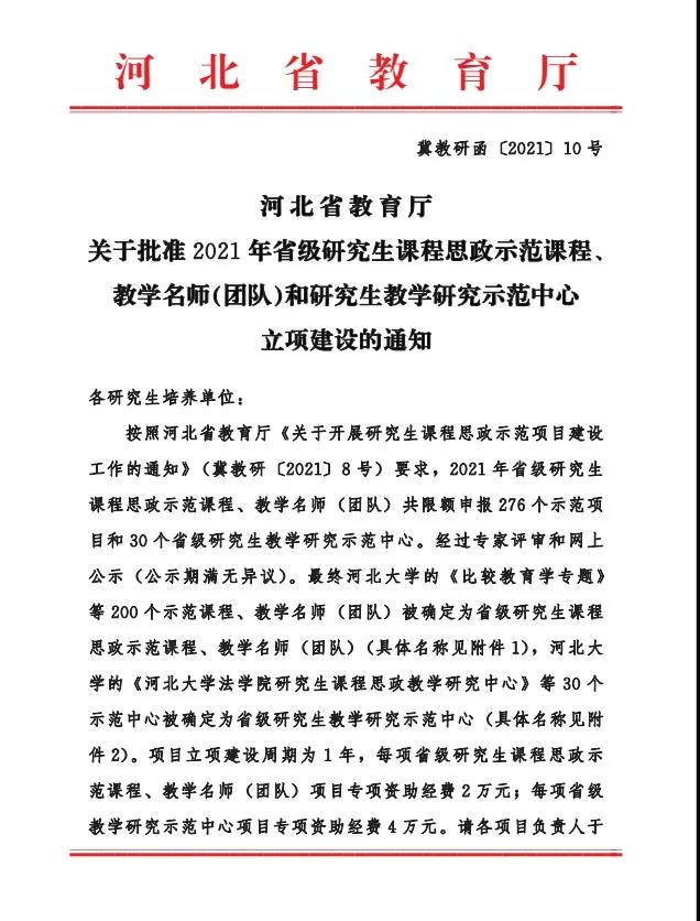 2021年10月28日,河北省教育厅发布了2021年省级研究生课程思政示范课程、教学名师(团队)和研究生教学研究中心批准立项建设的通知。太阳成集团tyc33455cc欢迎您研究生课程思政教学研究中心被确定为省级研究生教学研究示范中心。公司石晓飞副教授的公司治理课程、郑伟波教授的人力资源管理(MBA)课程及桑银峰副教授的营销管理课程入选2021年太阳成集团tyc33455cc欢迎您校级研究生课程思政示范中心立项建设项目,为提高公司研究生教学工作成效和研究生人才培养水平提供了有力支撑。