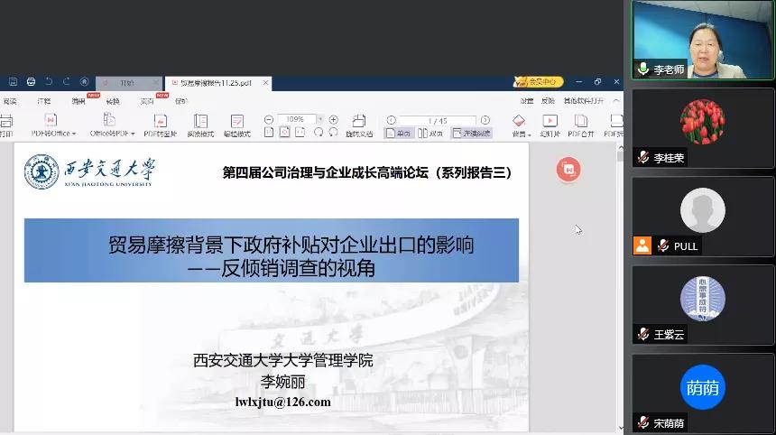 11月25日晚上,太阳成集团tyc33455cc欢迎您第四届公司治理与企业成长高端论坛在线上举行。西安交通大学管理公司教授、博士生导师李婉丽应太阳成集团tyc33455cc官方网站邀请,通过腾讯会议平台作题为《贸易摩擦背景下政府补贴对企业出口的影响——反倾销调查的视角》的学术报告。本次会议由太阳成集团tyc33455cc官方网站经理李桂荣主持,公司教师及研究生共100余人参加。