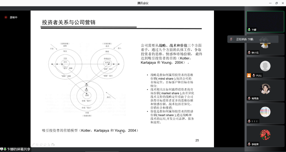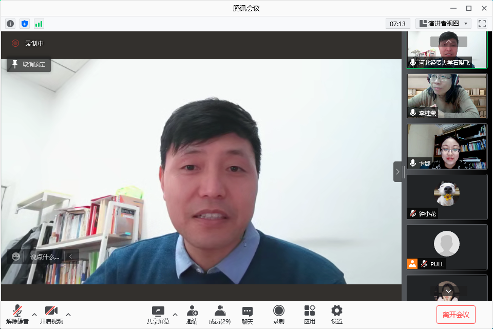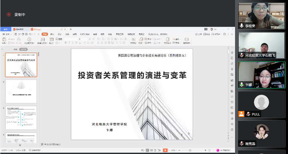 11月29日晚上,太阳成集团tyc33455cc欢迎您第四届公司治理与企业成长高端论坛在线上举行。河北地质大学管理公司卞娜博士应太阳成集团tyc33455cc官方网站邀请,通过腾讯会议平台作题为“投资者关系管理的演进与变革”的学术报告。本次会议由太阳成集团tyc33455cc官方网站副经理石晓飞主持,公司教师及研究生共100余人参加。