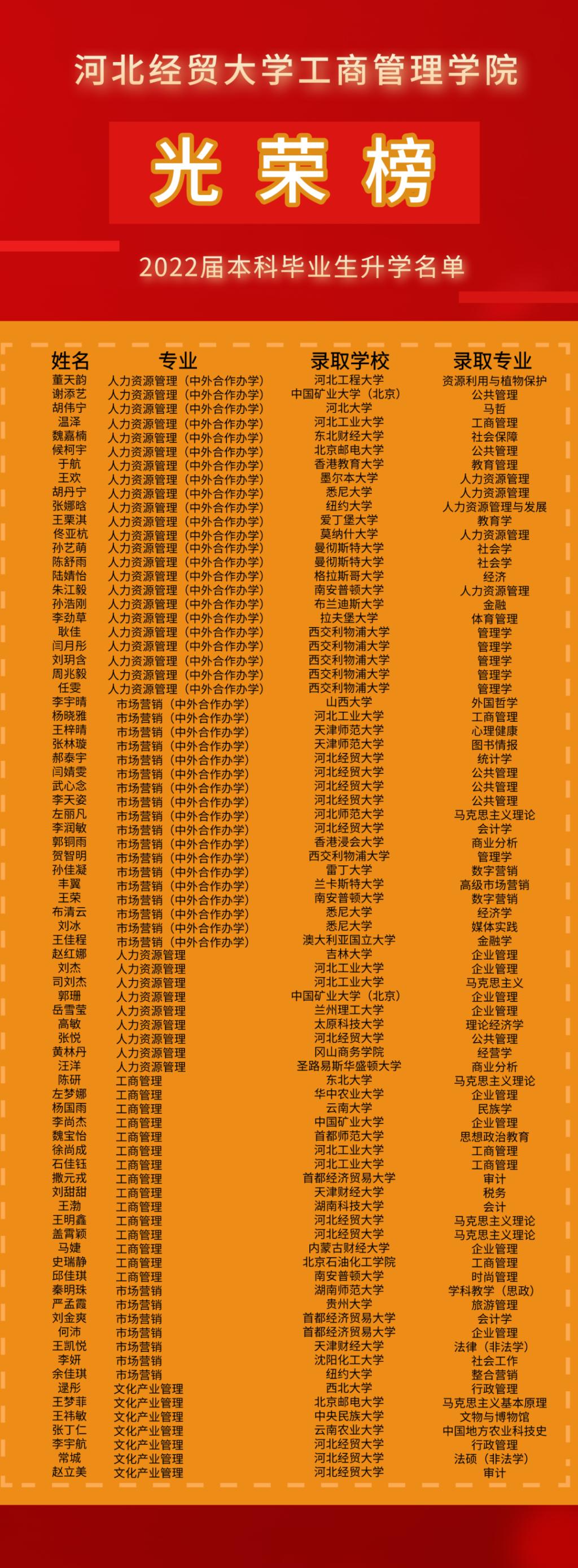 太阳成集团tyc33455cc官方网站2022届本科毕业生有8名同学成功获得普通推免生保研资格,50名同学成功考研至北京邮电大学、中央民族大学、东北大学、河北工业大学等国内知名高校。此外,20名同学已成功被澳大利亚墨尔本大学、美国纽约大学、澳大利亚悉尼大学、英国曼彻斯特大学等海外(境外)名校录取。