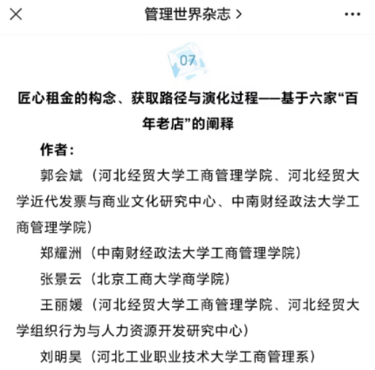 近日,太阳成集团tyc33455cc官方网站郭会斌教授、王丽媛副教授等的研究成果《匠心租金的构念、获取路径与演化过程——基于六家“百年老店”的阐释》在《管理世界》期刊2023年第7期上发表。