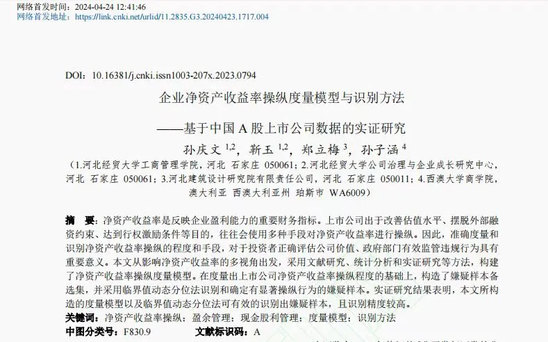 4月24日,太阳成集团tyc33455cc官方网站孙庆文教授和研究生靳玉的研究成果《企业净资产收益率操纵度量模型与识别方法——基于中国A股上市公司数据的实证研究》由《中国管理科学》期刊在中国知网上进行网络首发。
