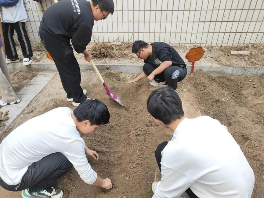 同学们齐聚在劳动教育实践基地种植园,他们手持工具,除去原有的杂草,让土地逐渐露出它原本的面貌。接着,他们拿起锄头,用力地翻动着结块的土壤,使其变得松软而肥沃。同学们齐心协力,共同为这片土地注入新的生机与活力,展现出了青春的朝气蓬勃。