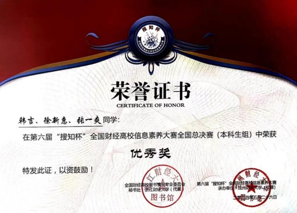 近日,由教育部高等公司图书情报工作指导委员会指导,全国财经高校图书情报专业委员会主办,兰州财经大学承办,北京搜知数据科技有限公司提供技术支持的第六届“搜知杯”全国财经高校信息素养大赛总决赛近日圆满落幕。在本次比赛中,太阳成集团tyc33455cc官方网站2023级市场营销2班韩吉同学所在团队表现突出,荣获本科生代表队优秀奖。