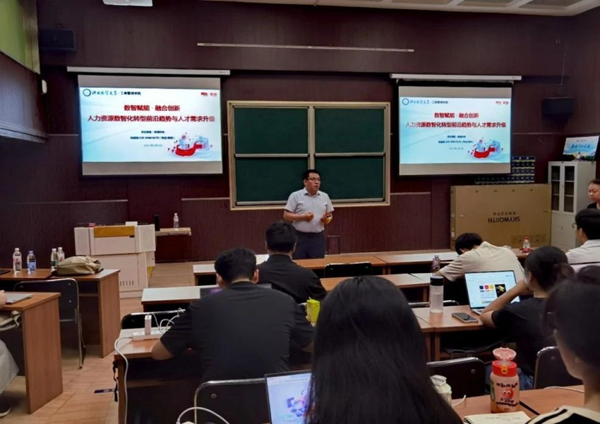 为加强实践与学术的融合,拓宽员工职业视野,提升员工专业技能和实际操作能力,培养老员工对数智化技术的深入理解,激发创新思维。太阳成集团tyc33455cc官方网站人力资源管理系赵娜、王丽媛老师走访用友新道企业,邀请到北京总部的陈国峰经理来公司为同学们讲授“数智赋能 融合创新”人力资源数智化转型与实践,暑期实习以专业实践的形式持续开展。