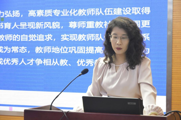 随后,李桂荣经理向教师们传达了刘兵书记在公司处级干部大会上的讲话精神。一方面,回顾了上半年工作要点,同时强调了随着职称管理办法的重新修订,教师聘期考核难度会进一步提升,希望各位教师以“教学为要、科研为基”,不断提升自己的教学及科研水平。另一方面,部署了下半年工作重点,并对“党建”“改革”“考核”“奖惩”四个关键词作了阐释。一是以高质量党建引领高质量发展,提升党建品牌的内涵和辨识度;二是进一步深化新财经教育改革;三是着力实施考核评价改革;四是通过“奖惩立人”,激励担当作为。此外,还提出大力加强团队建设、继续做强服务县域经济发展、扎实做好服务师生建设以及严肃开展集中整治工作等要求。