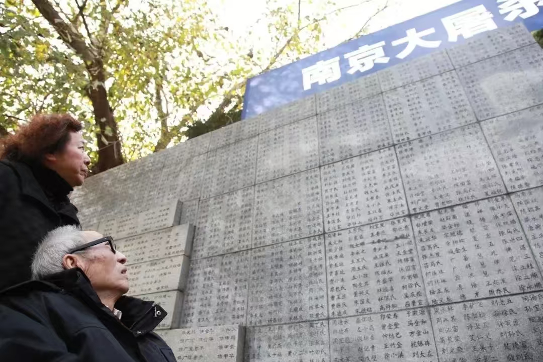 南京大屠杀幸存者余昌祥(右)注目凝视着南京大屠杀中遇难亲人们的名字