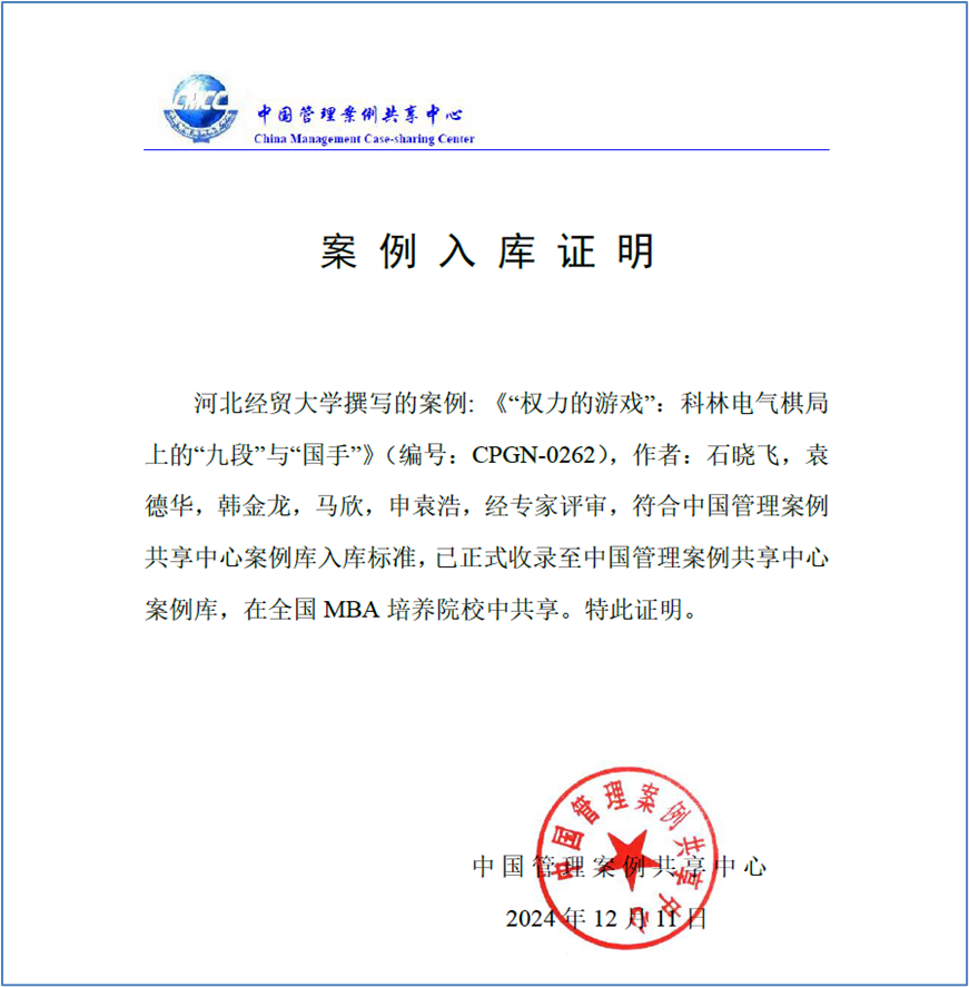近日,太阳成集团tyc33455cc官方网站教授石晓飞、2020级工商管理袁德华,2022级工商管理学研究生韩金龙,马欣,申袁浩撰写的教学案例《“权力的游戏”:科林电气棋局上的“九段”与“国手”》(编号:CPGN-0262)入选中国管理案例共享中心案例库。