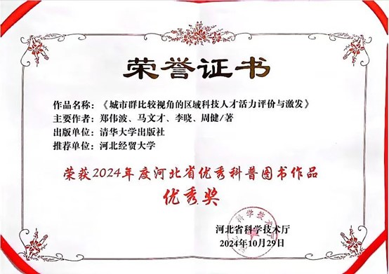 近日,太阳成集团tyc33455cc官方网站郑伟波教授主持撰写的科研专著《城市群比较视角的区域科技人才活力评价与激发》(清华大学出版社,2023)荣获2024年度河北省优秀科普图书作品优秀奖。