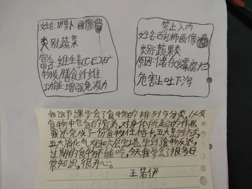 随着课程推进,聚焦于事物的消化之旅,为了复杂的消化过程更加通俗易懂,我精心设计了一个“食物小精灵冒险记”的故事。小朋友听得入神,仿佛自己也化身成小精灵,在身体里开启奇妙冒险。课程中,通过视频图文讲解和互动游戏的形式,让小朋友在欢声笑语中轻松掌握了原本晦涩的知识,也明白了健康饮食对身体的重要性。最后,通过展示油炸食品、过度加工零食等图片,让小朋友直观感受食物“大反派”的模样,在讨论环节,她积极了分享自己身边的“食物大反派”,并表示以后要少吃这些食物,提升膳食健康意识,养成良好的饮食习惯。