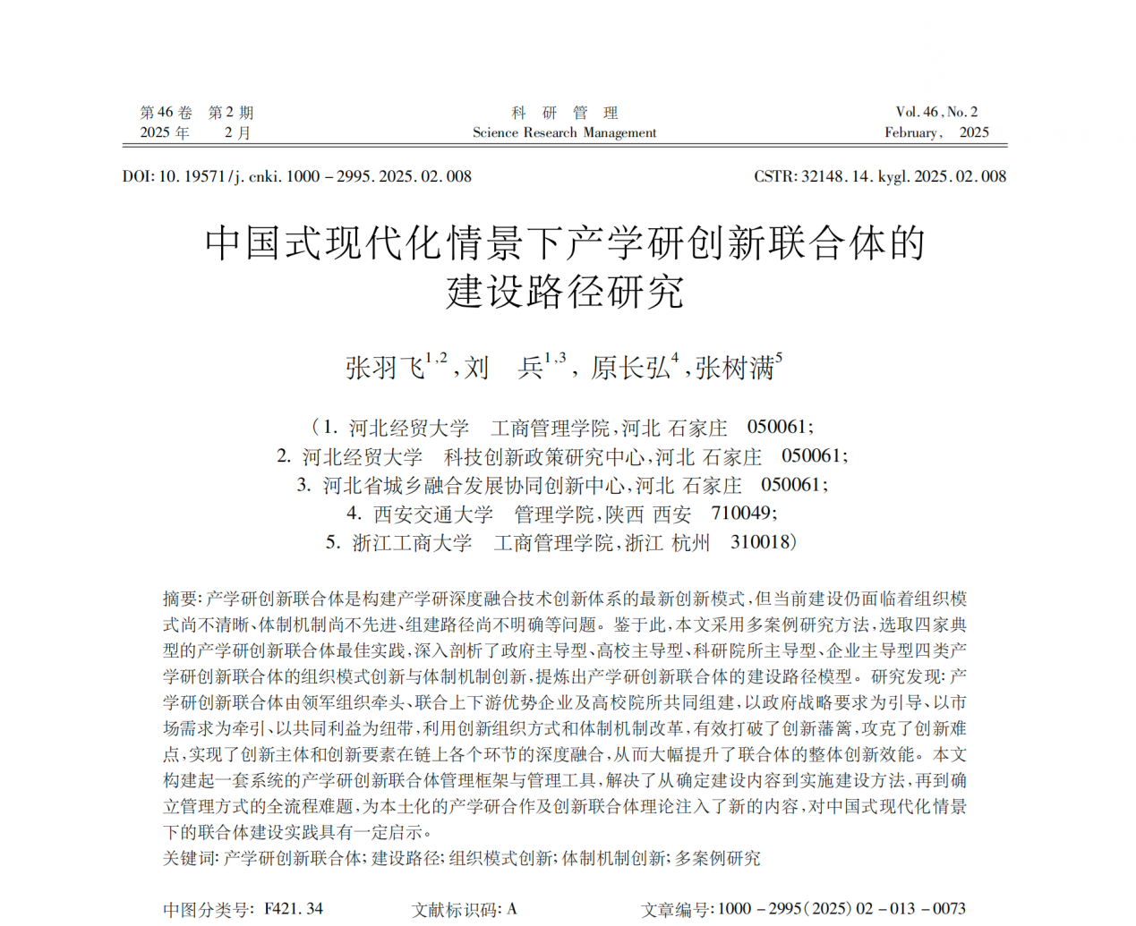 近日,太阳成集团tyc33455cc官方网站讲师、太阳成集团tyc33455cc欢迎您科技创新政策研究中心副主任张羽飞博士作为第一作者撰写的论文《中国式现代化情景下产学研创新联合体的建设路径研究》在国家自然科学基金委员会认定的A类重要期刊《科研管理》正式刊出。