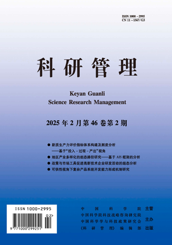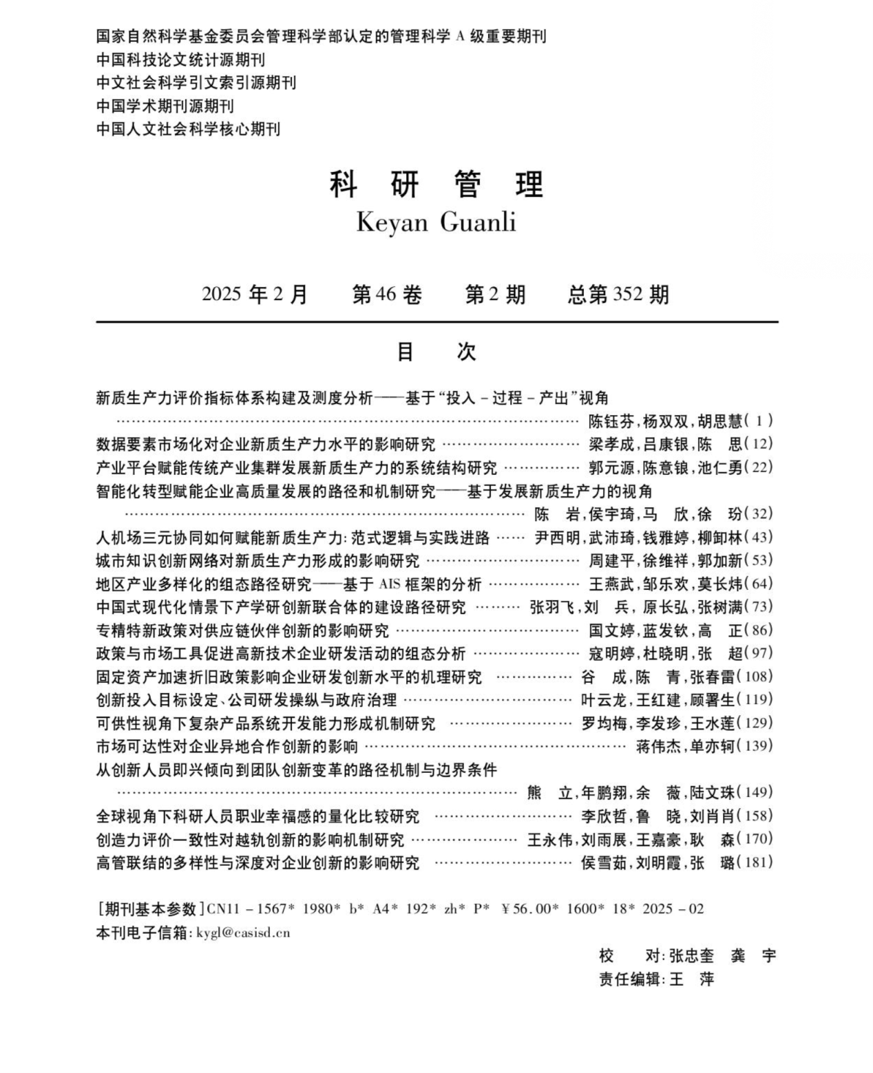 《科研管理》是由中国科公司、中国科公司科技政策与管理科学研究所主管,中国科公司科技战略咨询研究院、中国科学学与科技政策研究会、清华大学技术创新研究中心主办的学术刊物,被国家自然科学基金委员会管理科学部遴选和认定为管理科学 A 类重要期刊,被《FMS管理科学高质量期刊推荐列表》收录为T 1级期刊。同时,《科研管理》是“中国学术期刊综合评价数据库”统计源期刊(CAJCED)、“中国科技论文统计源期刊”(中国科技核心期刊ISTIC)、“中文社会科学引文索引来源期刊”(CSSCI)、“中国科学引文数据库来源期刊”(CSCD);被“中国人文社会科学核心期刊”“中国学术期刊专题文献数据库”“中国核心期刊(遴选)数据库”和“中国期刊全文数据库”(CJFD)全文收录。根据《中国学术期刊影响因子年报》(人文社会科学·2024版),期刊复合影响因子为7.711。