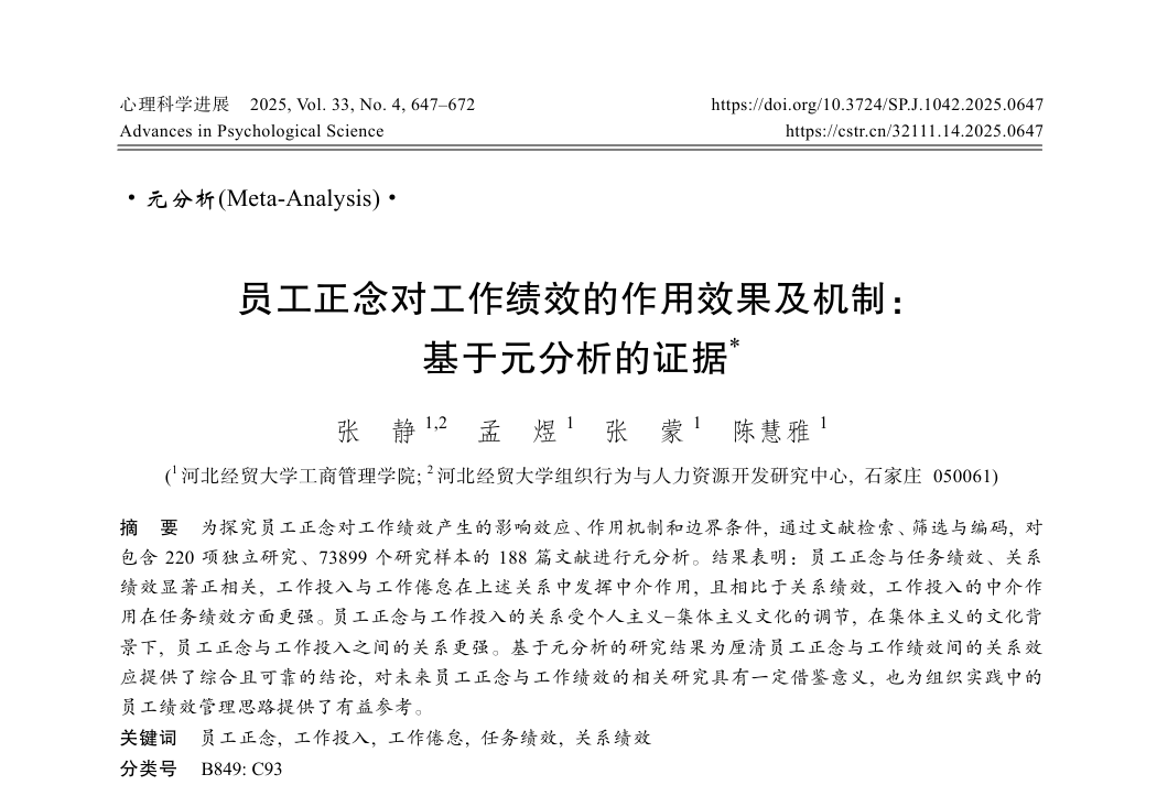 近日,太阳成集团tyc33455cc官方网站张静副教授、张蒙博士和研究生孟煜、陈慧雅的研究成果《员工正念对工作绩效的作用效果及机制:基于元分析的证据》在《心理科学进展》期刊2025年第4期发表。