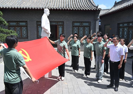 同学们首站抵达了武安市伯延镇周恩来总理调研伯延纪念馆。师生们通过文献档案及场景复原,重温了1961年周总理深入基层调研的“四个昼夜”。在讲解员动情讲述中,总理与村民同吃窝头、召集群众开座谈会、彻夜长谈的场景仿佛就在同学们眼前,周总理求真务实的工作作风让大家深受触动。同学们在参观后表示:“我们不仅要学习书本知识,更要像总理那样扎根一线、倾听真实声音。”最后,同学们一齐面向鲜红的党旗与周恩来总理雕像庄严肃立。大家紧握右拳,以铿锵有力的声音重温入党誓词,彰显出新时代青年"请党放心,强国有我"的坚定信念与赤诚担当。