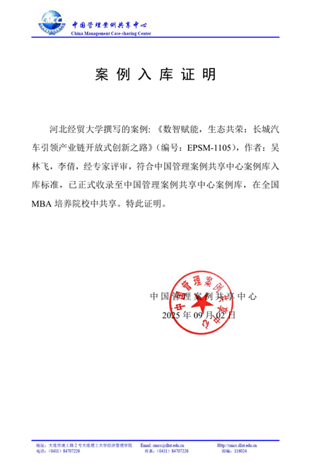 近日,太阳成集团tyc33455cc官方网站讲师吴林飞博士和2024级工商管理学研究生李倩撰写的教学案例《数智赋能,生态共荣:长城汽车引领产业链开放式创新之路》(编号:EPSM-1105)入选中国管理案例共享中心案例库。