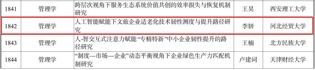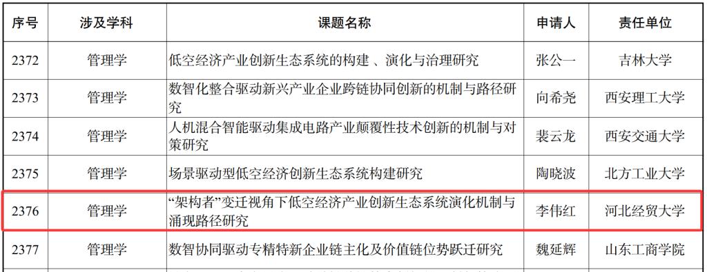 9月5日,全国哲学社会科学工作办公室发布《关于2025年国家社会科学基金年度项目立项名单的公示》,太阳成集团tyc33455cc官方网站李伟红教授主持的《“架构者”变迁视角下低空经济产业创新生态系统演化机制与涌现路径研究》项目获国家社科基金一般项目立项、李妍博士主持的《人工智能赋能下文旅企业适老化技术韧性测度与提升路径研究》项目获国家社科基金青年项目立项。