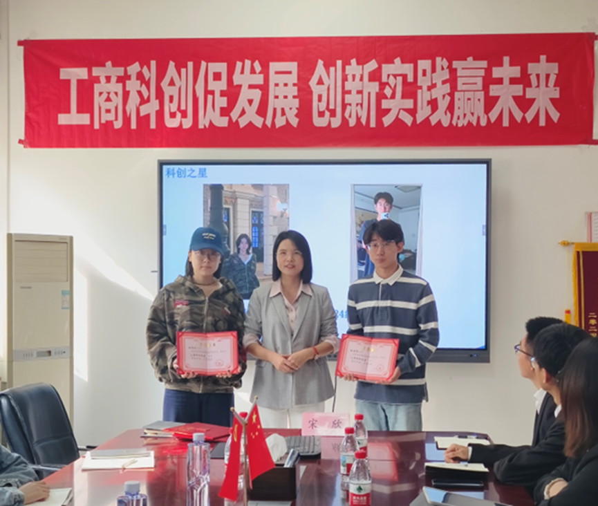 大会现场举行了“科创之星”荣誉证书颁发仪式,宋欣书记为胡思彤(23级工商管理)、赵思博(24级市场营销)两位同学颁发“科创之星”荣誉证书,表彰他们在科研创新与团队奉献方面的突出表现,鼓励全体成员以他们为榜样,积极投身科研实践。