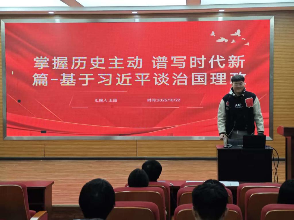 2025级工商管理学学硕研究生王喆在微党课上深入解读了《习近平谈治国理政》第五卷,《习近平谈治国理政》第五卷收录了习近平总书记在2022年5月27日至2024年12月20日期间的重要著作,共有报告、讲话、谈话、演讲、致辞、文章、指示等91篇,分为18个专题。王喆指出,《习近平谈治国理政》第五卷是全面系统反映习近平新时代中国特色社会主义思想最新成果的权威著作,以“中国式现代化”为核心主线,生动记录了以习近平同志为核心的党中央推动全面建设社会主义现代化国家迈出坚实步伐的生动实践。对于广大党员群众更加深刻领悟“两个确立”的决定性意义,增强“四个意识”、坚定“四个自信”、做到“两个维护”,具有重要意义。王喆表示,研究生学习《习近平谈治国理政》第五卷需以系统化、实践化为导向,通过逐篇研读原著、结合第一卷至第四卷连贯学习,尤其关注科技创新、新质生产力等与专业领域相关的内容,以问题导向思考中国式现代化与学科研究的结合点。最后将学习成果转化为科研选题或政策分析,通过“学用结合”的方式推动理论指导实践。