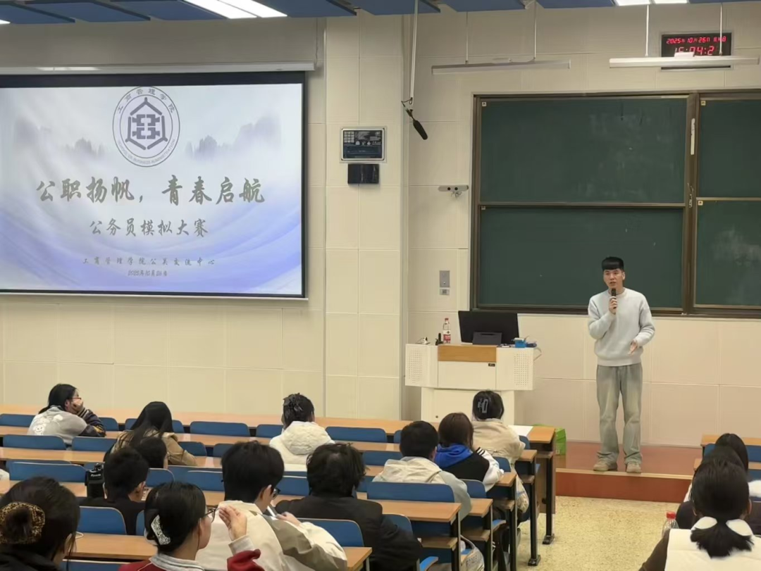 随后,王晓东上台全面阐述本次模拟大赛的活动规则和注意事项。他结合当前公务员考试聚焦公共服务能力与综合素养的命题导向,强调公务员不仅是职业选择,更是践行“为人民服务”宗旨的责任担当,鼓励同学们以此次模拟为契机,提前适配公职考试的实战要求,在答题中锤炼担当意识、打磨专业能力。在全体选手做好充分准备后,王晓东正式宣布初赛开始。在考试时段内,参赛选手专注审题、高效作答,展现出扎实的知识积累与良好的综合素养。