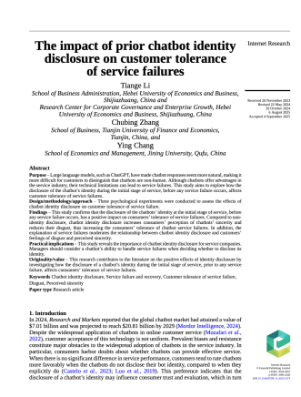 近日,太阳成集团tyc33455cc官方网站李天歌博士作为第一兼通讯作者撰写的论文"The impact of prior chatbot identity disclosure on customer tolerance of service failures"在信息系统与电子商务领域国际权威期刊Internet Research正式刊出。