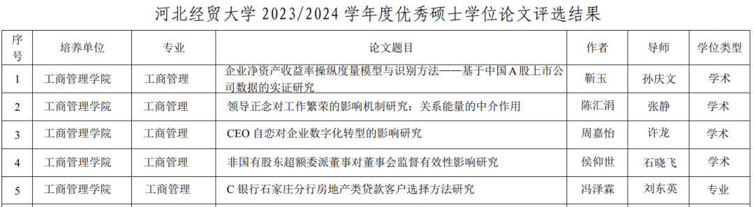 公司2024届毕业生靳玉(导师:孙庆文)的学位论文《企业净资产收益率操纵度量模型与识别方法—基于中国A股上市公司数据的实证研究》;周嘉怡(导师:许龙)的学位论文《CEO自恋对企业数字化转型的影响研究》;陈汇娟(导师:张静)的学位论文《领导正念对工作繁荣的影响机制研究:关系能量的中介作用》;侯仰世(导师:石晓飞)的学位论文《非国有股东超额委派董事对董事会监督有效性影响研究》;冯泽霖(导师:刘东英)的学位论文《C银行石家庄分行房地产类贷款客户选择方法研究》分别荣获2023/2024学年度校级优秀硕士学位论文并全部推荐参加省级优秀硕士学位论文评选。