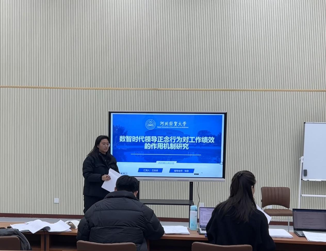 汇报人王雅柔以“数智时代领导正念行为对工作绩效的作用机制”为题,从引言、研究假设、研究设计、研究结果、结论与展望五个部分展开汇报。该研究从现实问题出发,寻找更具时代适应性的领导行为,基于资源保存理论,实证检验领导正念行为通过促进员工失败学习与抑制人工智能冲击意识进而提升员工工作绩效的作用机制,为领导正念行为的实践应用提供重要启示。