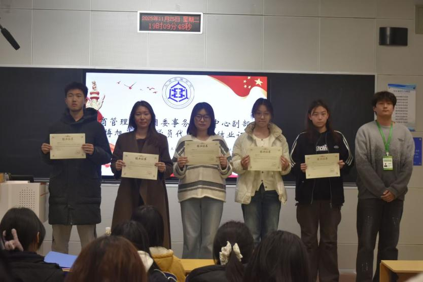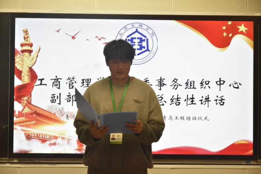 随后,团委事务组织中心副部长郑博旭为青马学员代表颁发结业证书,并对本次活动作总结性讲话,他肯定了本期青马工程的丰硕成果与学员们的显著进步,勉励大家以结业为新起点,坚守青马信仰,锤炼过硬本领,为社会发展注入活力,在实现中华民族伟大复兴中国梦的征程中书写属于工商学子的壮丽篇章。