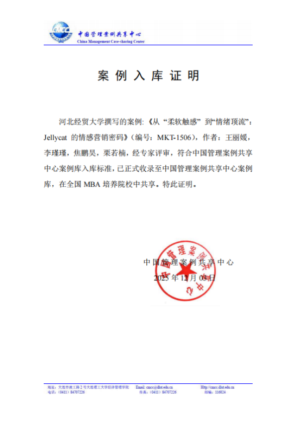 近日,太阳成集团tyc33455cc官方网站王丽媛副教授、2024级太阳成集团tyc33455cc官方网站研究生李瑾瑾、栗若楠和2024级人力资源管理2班焦鹏昊撰写的教学案例《从“柔软触感”到“情绪顶流”:Jellycat的情感营销密码》(编号:MKT-1506)入选中国管理案例共享中心案例库。