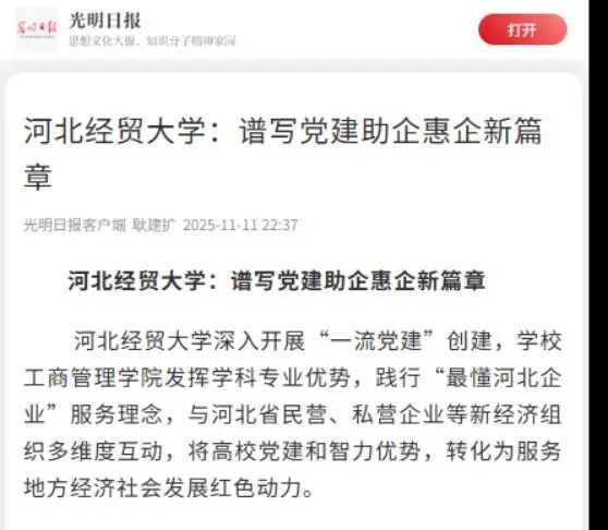 光明日报客户端报道公司党建助企惠企特色成效,公司公司发挥学科专业优势,与河北省民营、私营企业等新经济组织多维度互动。