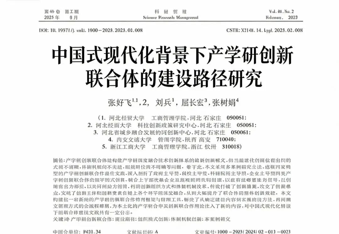 张羽飞博士作为第一作者撰写的论文《中国式现代化情景下产学研创新联合体的建设路径研究》在国家自然科学基金委员会认定的A类重要期刊《科研管理》正式刊出。