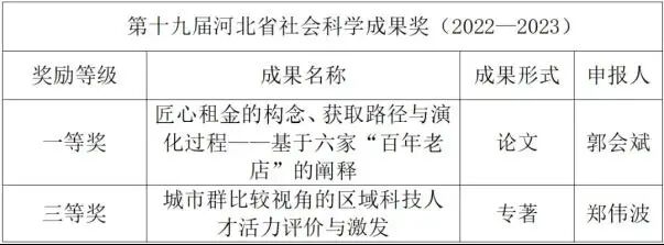 第十九届河北省社会科学优秀成果奖名单公布,公司郭会斌教授、郑伟波教授的成果分获一等奖和三等奖。