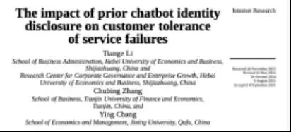 公司青年教师李天歌博士作为第一兼通讯作者撰写的论文"The impact of prior chatbot identity disclosure on customer tolerance of service failures"在信息系统与电子商务领域国际权威期刊Internet Research正式刊出。