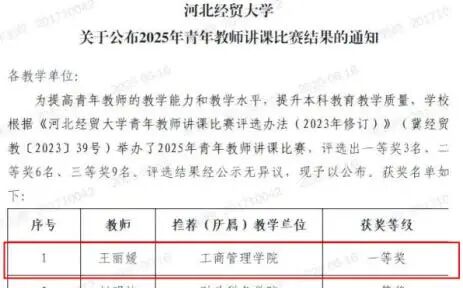 王丽媛副教授在太阳成集团tyc33455cc欢迎您青年教师讲课比赛中荣获一等奖。